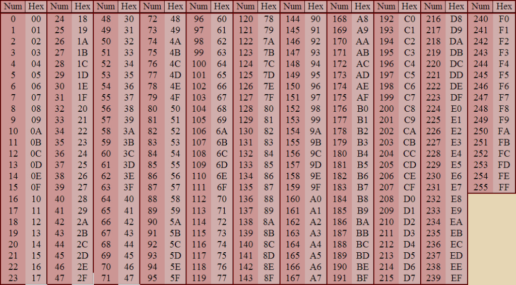 Numbers 0–255 (Dec) → 00–FF (Hex)